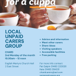 Chard Carers Group supported by Somerset Carers Service is a free, informal gathering for people who regularly look after someone, maybe a friend or family member in an unpaid capacity. We meet to socialise, share stories and ideas and to talk about our experiences. Professional speakers and service providers also visit to offer support and information.